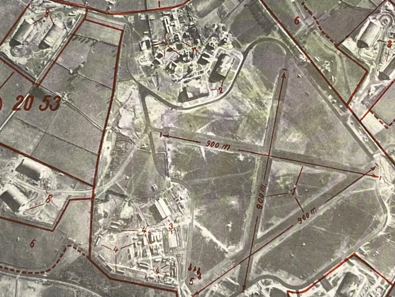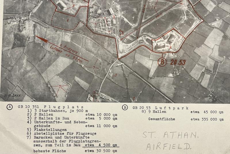 Original 1941 Luftwaffe target information aerial photograph of ' Llantwit Major Luftpark ' - St Athan airfield. Targets within the airfield are also outlined and identified including AA sites, hangars and barracks. Good, clean condition, has been folded with a provenance from a member of the RAF.