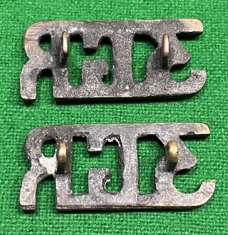 A pair of cast shoulder titles for the 3rd Gurkha Rifles. Heavy brass construction with typical flattened retaining loops common to locally made examples. Good, used condition.