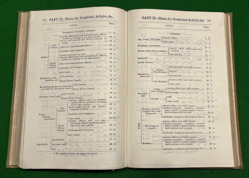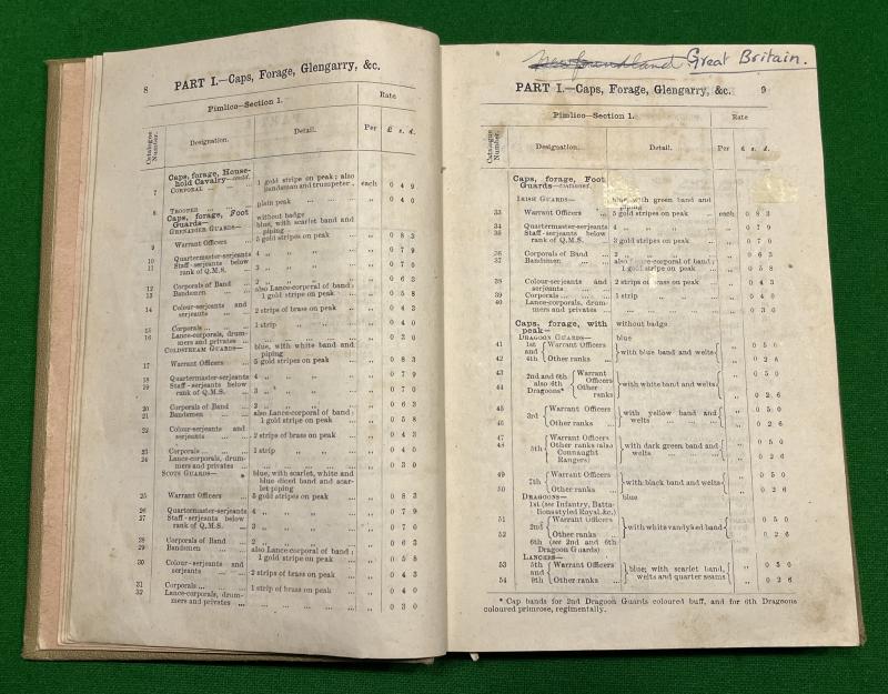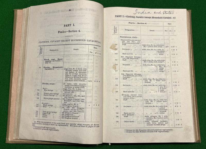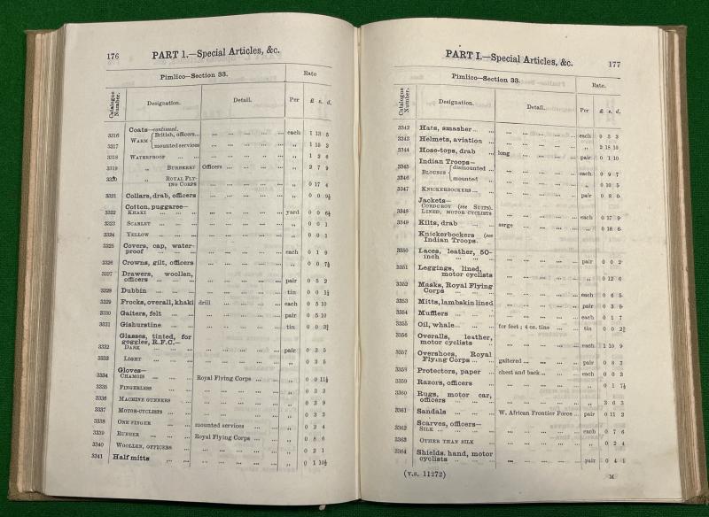 Unusual 1915 British manual entitled ' Priced Vocabulary of Clothing & Necessaries '. 352pgs covering everything from cap badges to pantaloons and the relevant costs to be used when calculating replacement costs, rates for making-up clothing and allowances. Unit marked for the 3/1st Welsh Divisional Cyclist Company. Good, used condition with marked covers.