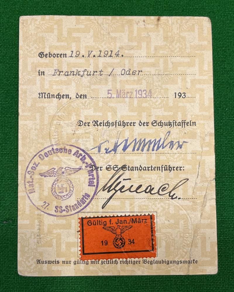 Early 1934 SS ID or Ausweis to SS Mann Walter Liersch. He was born in Frankfurt/Oder in 1914. Ink stamped Himmler signature with early eagle and NSDAP script, with hand signature of an SS Standartenfuhrer. Red stamp at bottom indicating dues were paid for Jan/March 1934. His picture is on opposite side and embossed with a stamp. His number of the SS Ausweis is 155263. Good condition with some minor creasing and contemporary pencilled annotations. Scarce.