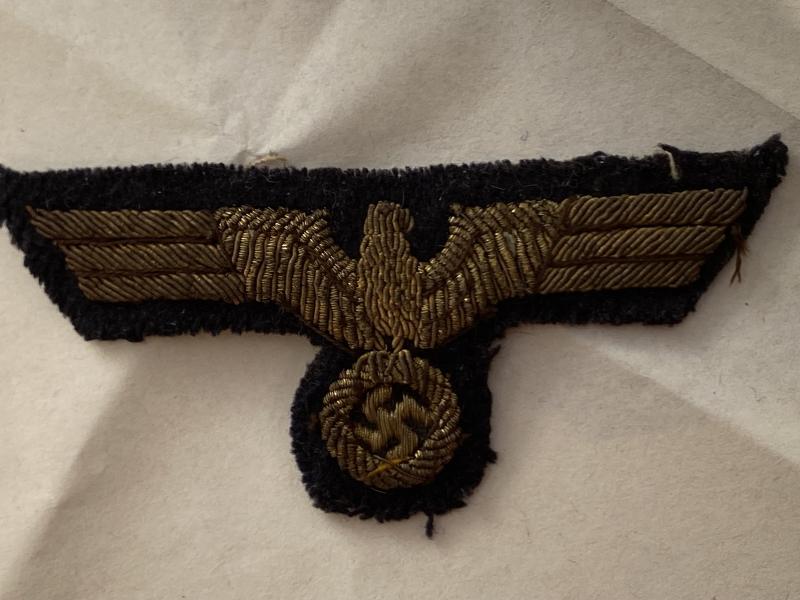 Just purchased from a veterans family member, this is a lovely gold bullion wire Third Reich naval officers breast eagle, on dark navy wool backing. Fantastic quality and probably a very senior officer. No damage or wires loose, complete backing with several threads remaining where is was sewn to a tunic.