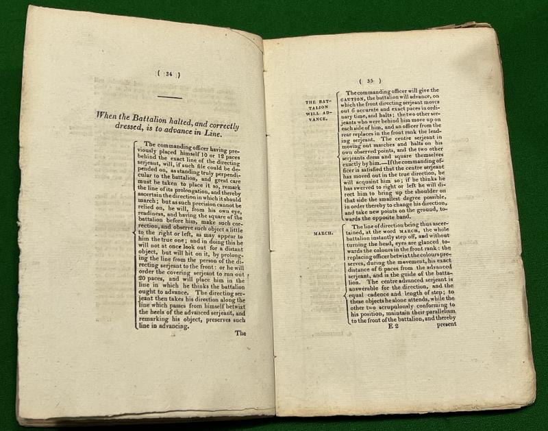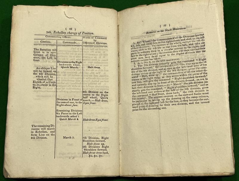 Napoleonic period tract entitled ' Instructions for Training & Exercising the Local Militia '. The 109pg book published in 1809 by T.Egerton, Whitehall covers many aspects of training the Local Militia including the operation and use of the ' firelock ', bugle signals, marching, manoeuvring and hollow squares. Generally clean condition with worn card covers with some staining, minor tears etc. Uncommon and early.
