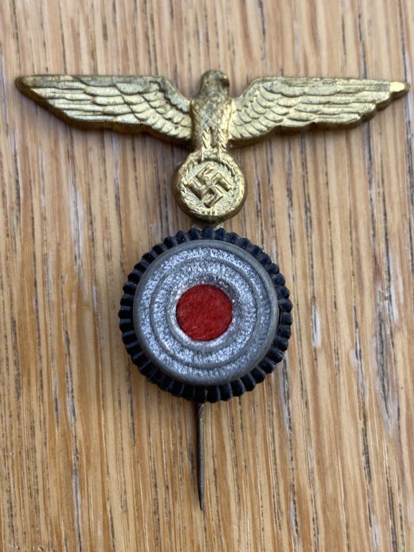 A nice example of the eagle and roundel badge pinned to the front of the naval ratings flat cap, often called a ‘Donald Duck’ cap!! Worn both with the blue cloth and summer white caps.