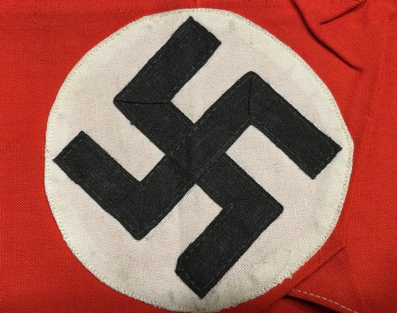 Multi-piece construction N.S.D.A.P./ Party armband. This souvenired example is still a little crumpled from storage and is in excellent, clean condition retaining its RZM label to the interior. Two areas where it appears retaining pins have been used to retain it to a uniform leaving small holes.