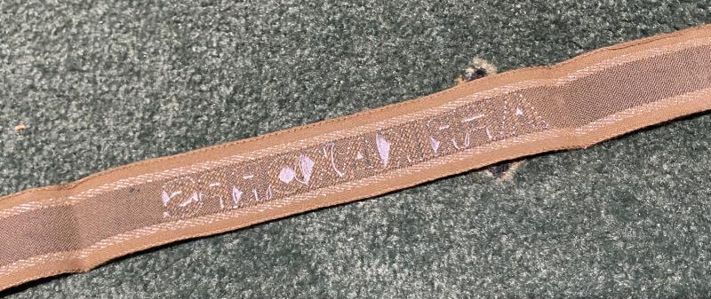 An unissued full length cuff title worn on the right sleeve of the tunic. Multi coloured tan/green with bullion lettering. Mint condition.
