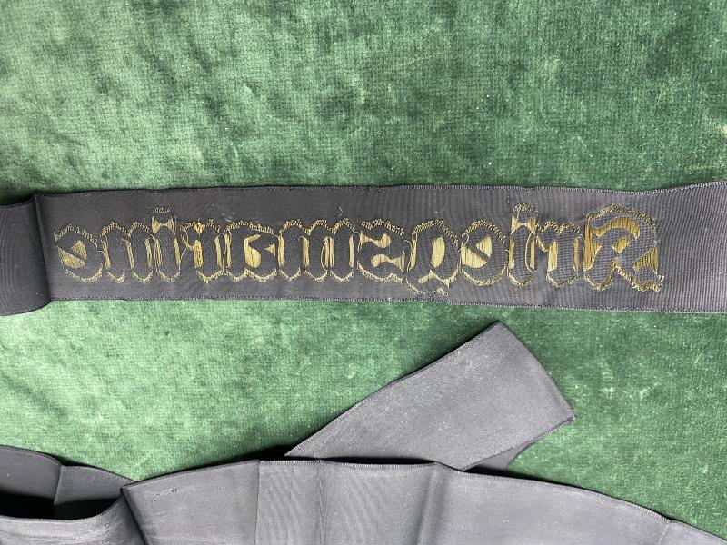 Worn on the Third Reich naval rating sailers cap, commonly known as a Donald Duck cap. This is the FULL LENGTH’ black satin ribbon worn around the rim. Unusual to find a complete, un-cut one, as these are usually shortened to fit on displays. Beautifully woven KRIEGSMARINE lettering in gold wire. Mint condition.