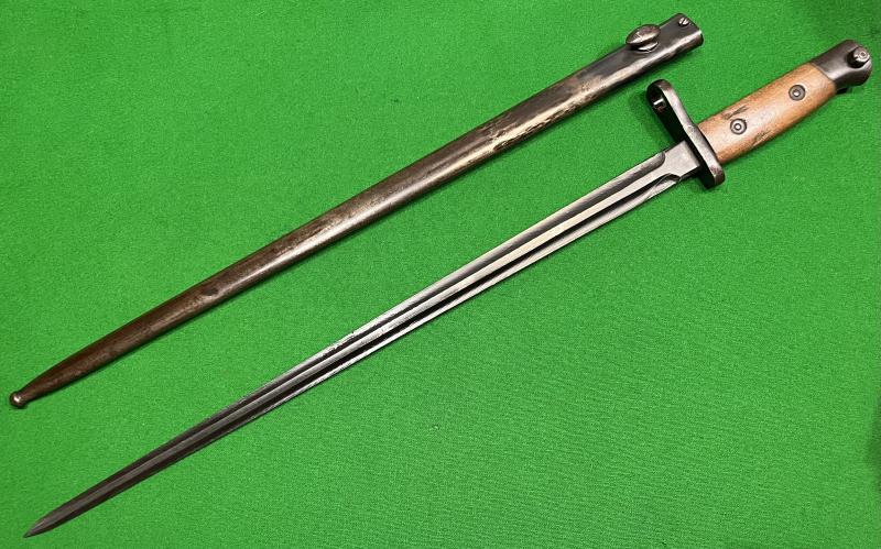 Uncommon example of a WW2 period M1916/35 bayonet issued to the Belgian Army. This later model is distinguished by having a 15mm muzzle ring. Blackened 445mm double edged blade with matching numbers to cross guard and scabbard. Faint unit inscription to scabbard stud. Clean example.