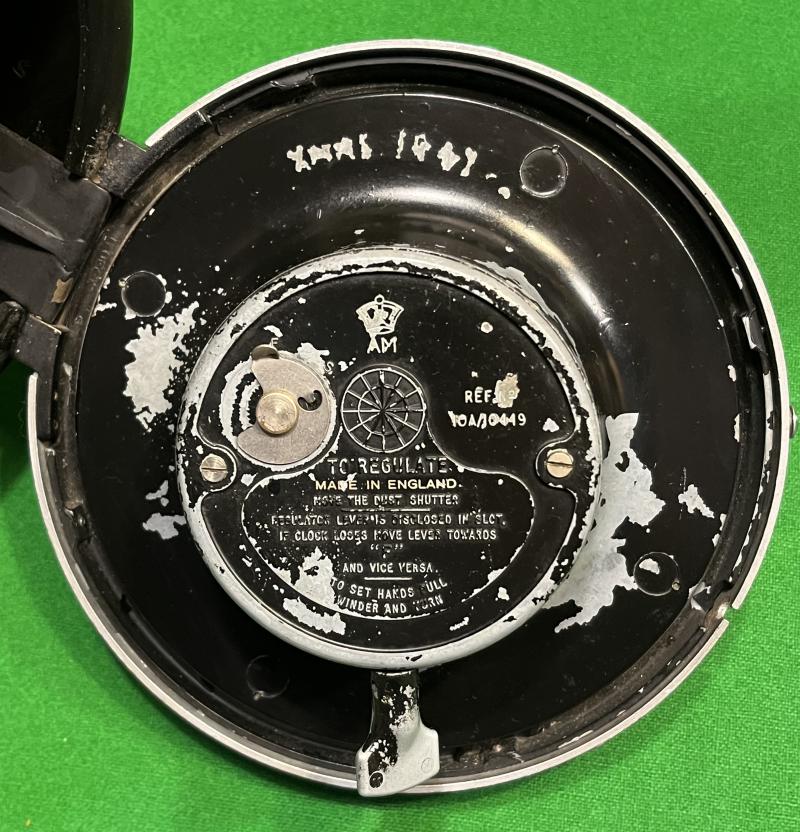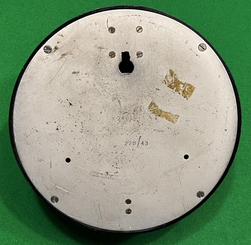Air Ministry, English made wall clock with 18cm diameter bakelite case and hinged chrome bezel. 14cm white dial with black Arabic numerals and hands, dial now spotted. The movement is integral with the rear of the bezel and dial, it is marked with the stores reference number 10A/10449. Movement has integral winder, appears to keep reasonable time but would suggest a service. Various service dates marked inside of the case and the probable date of liberation ' Xmas 1947 ' scratched into movement. Reverse marked ' X24016 ' and ' 228/43 '.