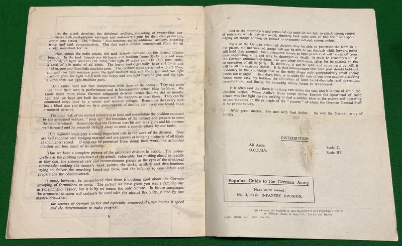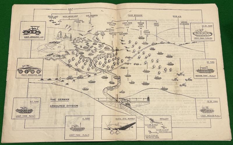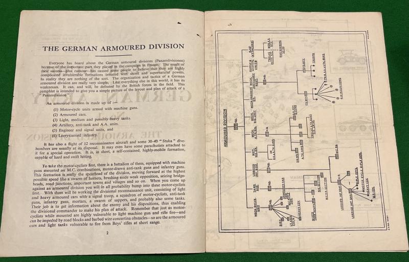 1941 Popular Guide to the German Army No.1 ' The Armoured Division '. 7pg, gate-fold leaflet produced by M.I.14 outlining the current knowledge ( Feb. 1941 ) about the make up of German forces. Illustrated with sketches and diagrams. Good, used condition with some light marking, has been folded.