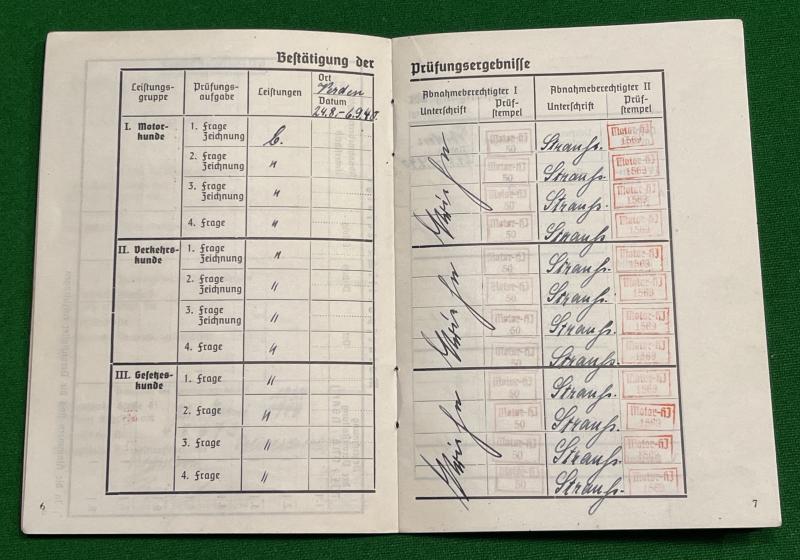 Motor HJ Prufungsabzeichen dienstbescheinigung or Motor HJ examination badge service certificate. Issued in 1940 to a member of HJ Motorstamm 75 in Bremen. Photograph to interior with various stamps and cancellations. Good clean condition with faded front cover, uncommon.