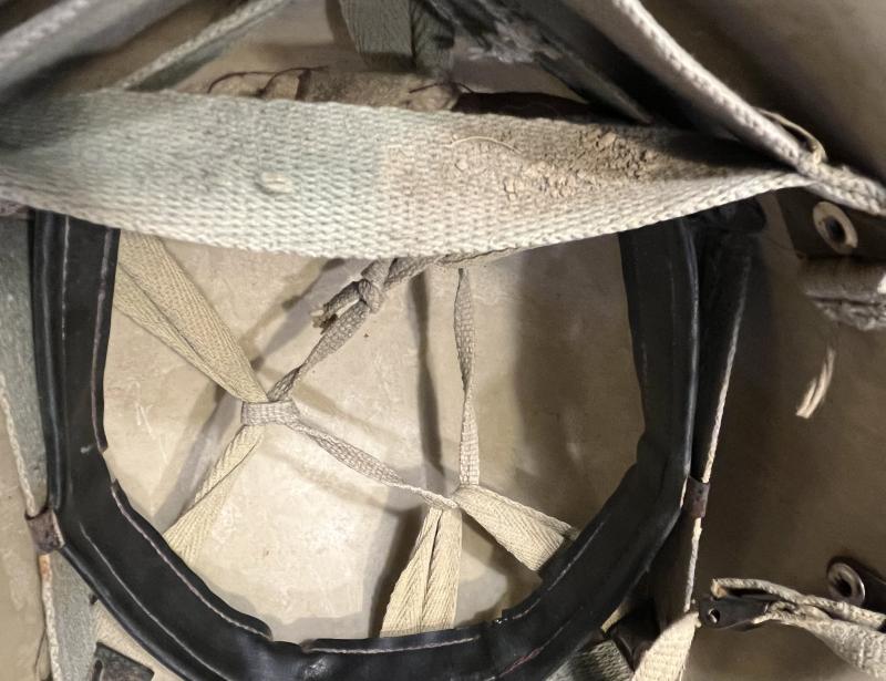 An example of a Gulf War souvenir, a Type 2 Iraqi M90 combat helmet. The type 2 can be denoted by a yellow (Sand) color finish, tan liner webbing, green chinstrap webbing, and black hardware. The helmet does not have a rubber rim and shows considerable service use with scratches and cracks and faded webbing liner which still has Iraqi mud encrusted to the interior.