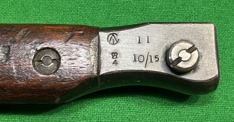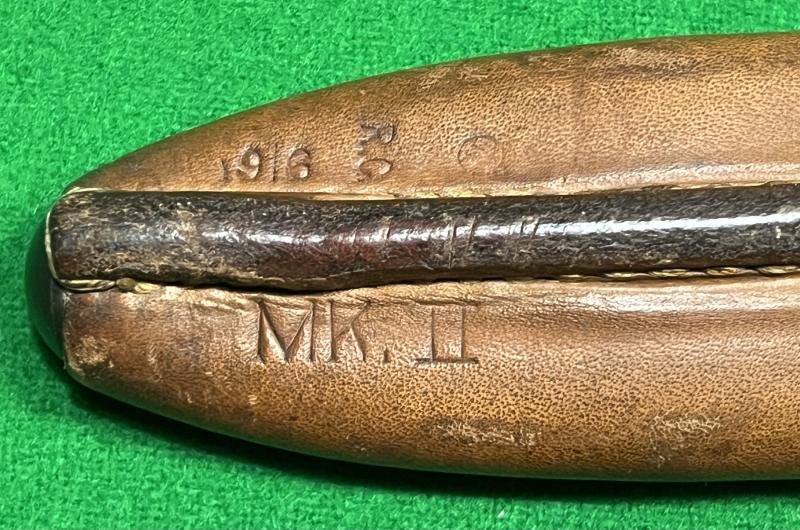 An excellent example of a WW1 Canadian Ross Rifle bayonet. Manufacture marked to the one side of the pommel, with the opposite side stamped with a Canadian C-Broad arrow and dated 1911 with British acceptance stamps and dated 10/15. 255mm blade in bright, clean condition with further proof marks to both grips. Leather MkII scabbard dated 1916. Excellent , clean example with light rubbing to blued areas, light bruising to grips.