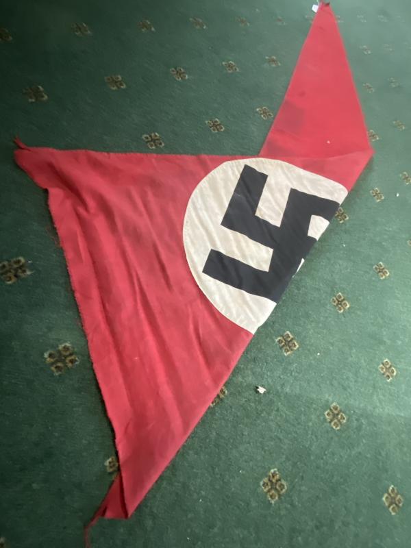 A typical NSDAP/PARTY banner that would have hung in the streets or from a building. Produced at the time probably in the hundreds of thousands. All different sizes, all different qualities. This is an all cotton example with printed swastika on white circle, one sewn to each side. This would have hung vertically from a pole or similar. However, this one has been ripped down and the stocked pocket to the top is no longer there. Other than that, it has a couple of small age holes near the bottom and the tip is a little frayed. It is a good, original example and measures 64” long and 26” at its widest point.