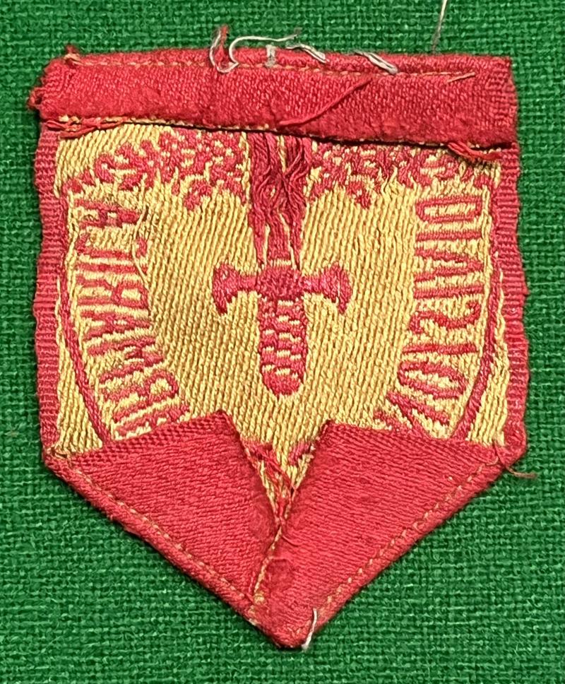 Machine embroidered WW2 Italian 62nd Infantry Division "Marmarica" arm shield. The division was formed on 9 May 1937 in Derna in Italian Libya and named Marmarica after the antique name for the surrounding region. It was effectively destroyed at the Battle of Bardia in 1941. Good, used condition with clear evidence of having been removed from a uniform.