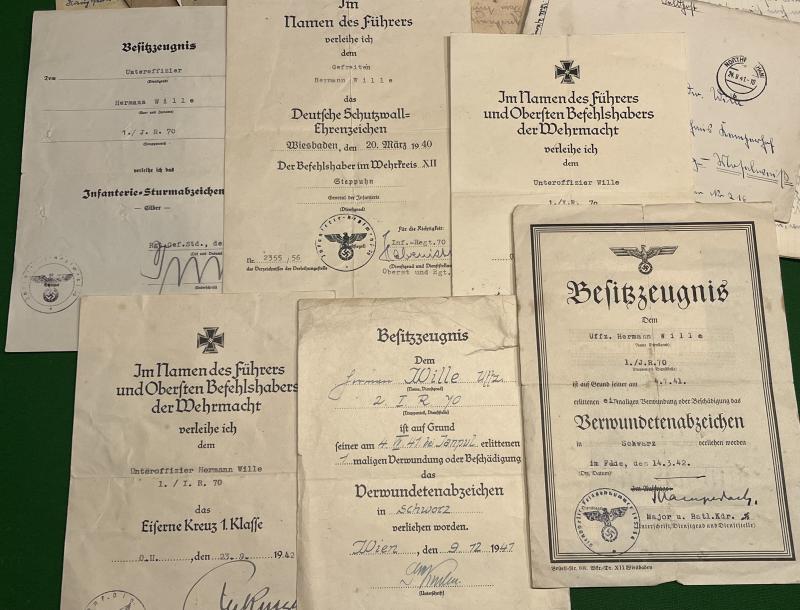 Wehrpass, award certificate and correspondence grouping to Uffz.Hermann Wille of I.R.70. Wille was killed after being hit in the chest by a shell splinter on 26.09.42 south of Mosdok am Terek.in the Caucasus. This occurred in operations undertaken in Operation Edelweiß and almost at the highpoint of the German advance in this area with Kleist's 1st Army.