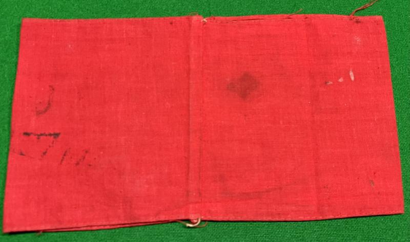 Red cotton armband with separately applied BeVo weave swastika on white disc. A good used example of the standard red/white Party armband used by many Third Reich organisations. Slightly grubby with minor stains and retaining it's paper RZM label, armband has been folded.