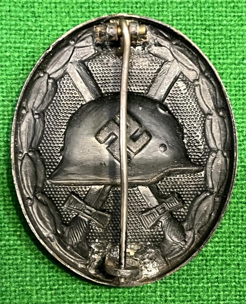 WW2 1939 Wound Award in black. Die stamped steel example with needle pin in excellent, clean condition with some wear to high points. Not maker marked.