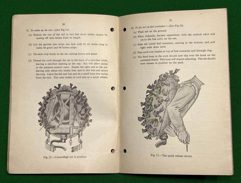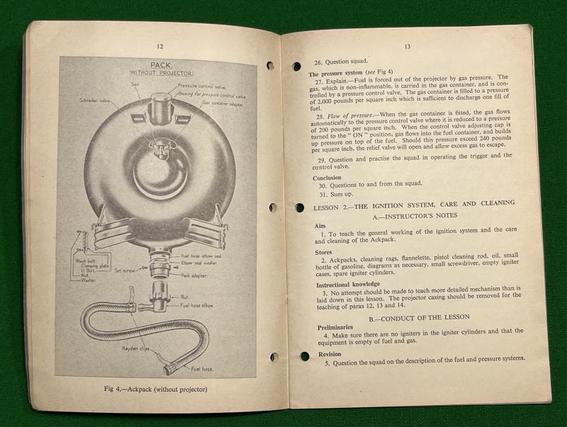 1952 Infantry Training Vol.I - Infantry Platoon Weapons - Pamphlet No.13 ' The Ackpack Flame Thrower '. 40pgs demonstrating the use of the Flamethrower, Portable, No 2. Designed during WW2 with 7000 units being produced between 1943 and 1944 known as the Lifebuoy and latterly as the Ackpack. Illustrated throughout with b/w photographs and diagrams. Good, clean condition with some light fading to covers. Uncommon.