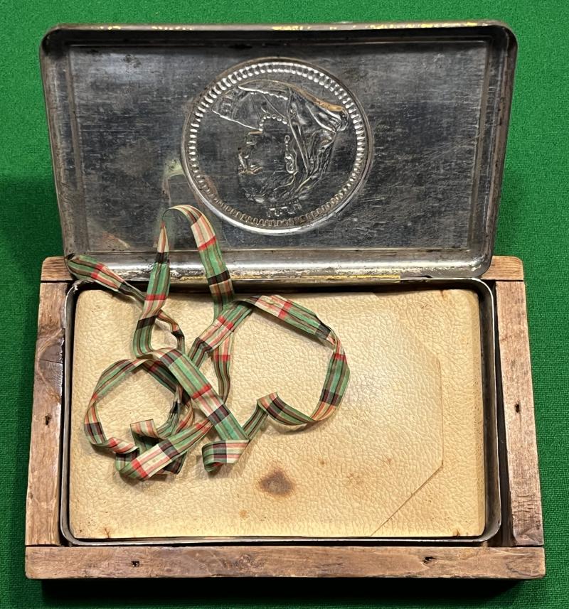 A Queen Victoria gift chocolate box, 1900. In 1899 Queen Victoria decided to send a gift of tin boxes of chocolate to her troops serving in South Africa. It was intended that every soldier and officer should receive a box with the inscription 'South Africa 1900' and in the Queen's handwriting 'I wish you a happy New Year'. Contained in a litho printed tin with rounded corners for ease of storage in a soldier's knapsack and containing a half-pound of vanilla chocolate. This example was mailed home in a purpose built wooden box which is now missing its lid and displays a number of stamps to the reverse. The tin itself is now sadly empty but still retains the original wrapping to the missing chocolate with a ribbon tie. evocative souvenir of the Boer War.