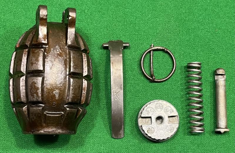 A good condition, all matching British, WWII, No.36M MkI Hand Grenade. Features approx. 85%+ of the original brown lacquer and filling markings remaining. All parts manufacturer marked ' K* ' for A Kendrick & Sons of West Bromwich. ' Manufacturer marked to body, lever, 1943 base plug and core. All parts present and fully strippable. Good example.