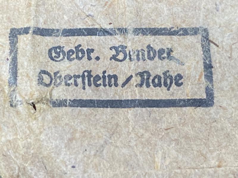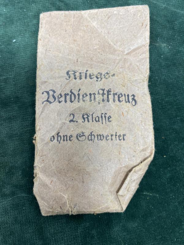 Following a recent trip the biggest militaria show in the world, I picked up a few interesting pieces. On the table next to ours was an American dealer with a variety of items, one was a foot locker from an American GI veteran. Amongst the cloth items and US bits and pieces, this GI had obviously raided a factory or retail shop and bought back these medals. All are untouched, in the original factory brown paper envelopes, with the medal wrapped in wax paper. Unopened! The original length of ribbon is folded inside. These are all War Merit crosses 2nd Class without swords in bronze finish.Each packet is marked on the reverse with the same makers ink stamp. I have 6 examples. All made by Gebr. Bender Oberstein/Rafe