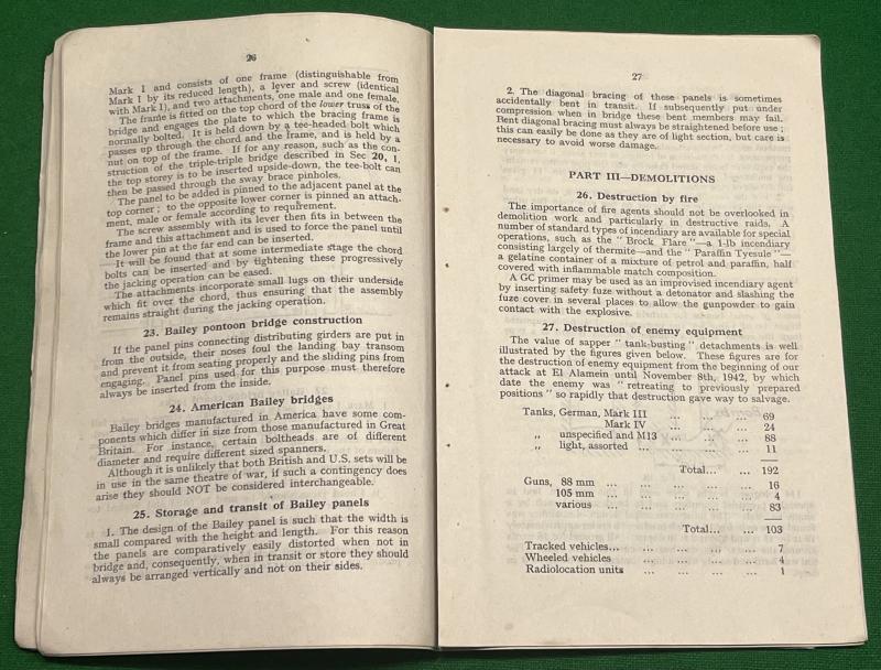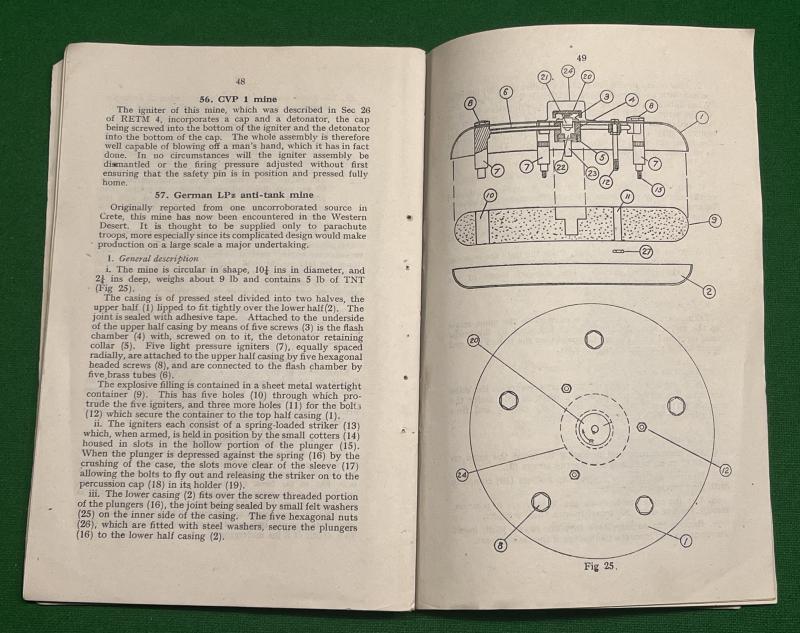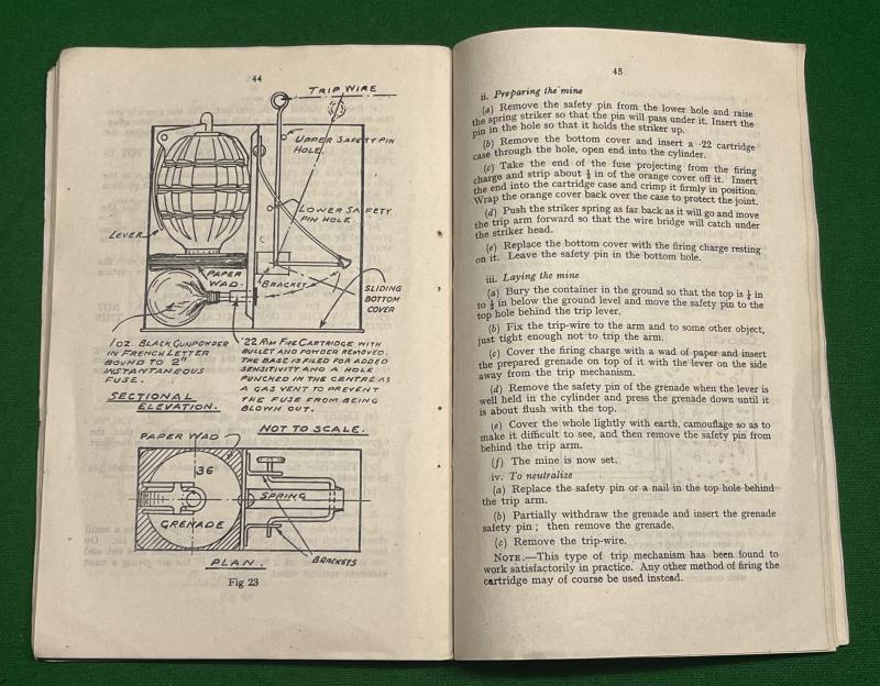 1943 RE Training Memorandum - No.5. 62pgs covering subjects as diverse as traffic lanterns, Bailey and suspension bridges, mine lifting and demolitions. Most interesting is the large section on booby traps, both British and German with diagram and exploded drawings of the pressure/pull switch, electric. Good, used condition, staples absent.