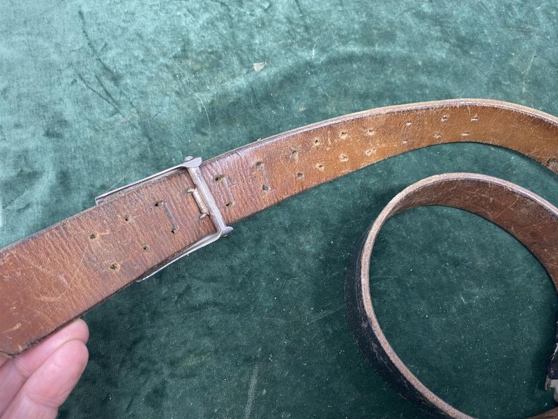 A nickel plated Hitler Youth belt buckle with black leather belt. The belt is a full sized adult length 100cm, so has been altered to fit a slim youth by the addition of many adjustment holes Leather is good condition otherwise. The buckle has some slight corrosion to the surface but otherwise excellent. Reverse is marked with a stamped RZM circle and RZM code 4/23.(Franke & Co., Lüdenscheid).A nice used and as worn combination.