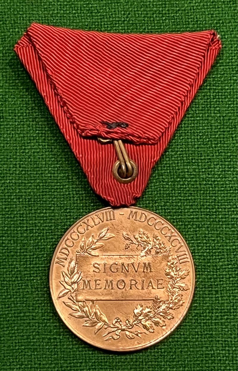 Original Austrian military issue Jubilee Medal issued in 1898 to commemorate the long reign of Emperor Franz Joseph I. Gilded bronze finish with original ribbon.