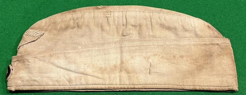 Original WW2 German Luftwaffe tropical pattern O/Rs overseas/side cap. Manufactured from tropical cloth with the original machine embroidered triangular Luftwaffe cap eagle and separate cloth roundel cockade. Exterior stained and faded with clear evidence of the original colour revealed behind the side curtains. Has been stored folded showing a cleaner side. Various snags and stains to the exterior with a clean interior with initials embroidered into the coarser cloth lining. Original souvenired example.