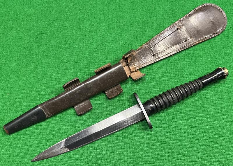 An example of the wooden handled 3rd Patt. Fighting Knife. Of wartime construction contained in a Wilkinson's style of scabbard. Clear signs of sharpening and use with a chip to the handle and some hairline cracks. The scabbard has been modified by the removal of the elastic retainer and the cutting of the scabbard body to retain the knife in the scabbard in a more positive manner. A good example of a well used and field modified knife.