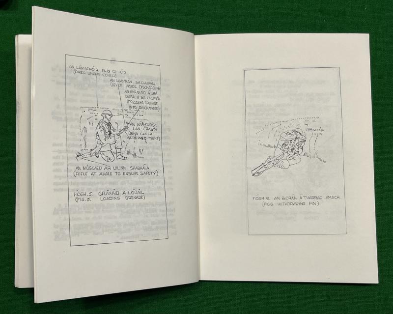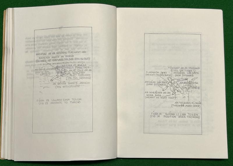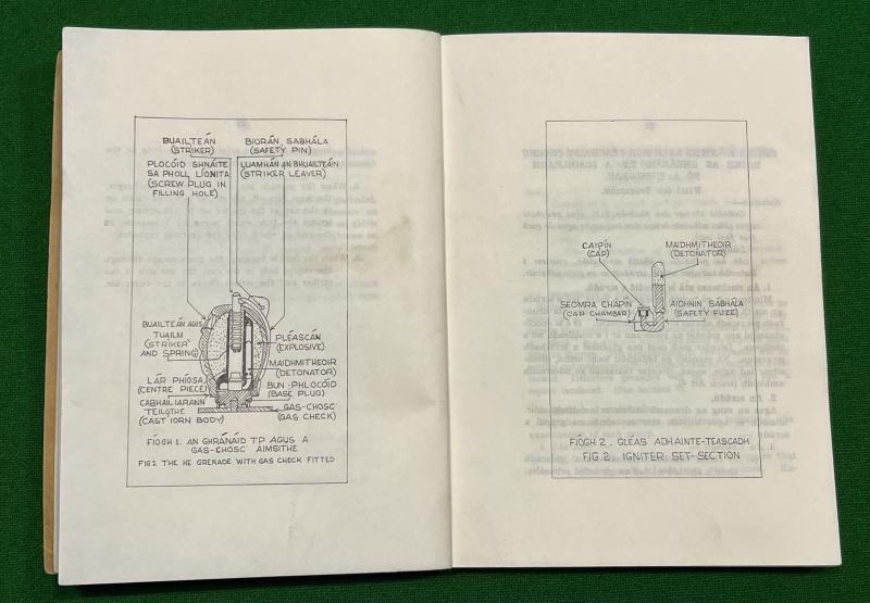 1965, dual language manual produced by the Irish ( Eire ) Defence Forces for the use of the venerable Mills 36 Grenade. 141pgs covering all aspects of the grenade from workings, deployment, cup discharger to destruction of blinds. Illustrated through out with diagrams. Unusual and in good, used condition with some light marking.