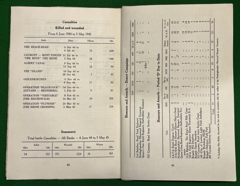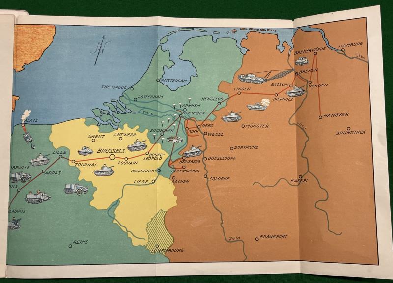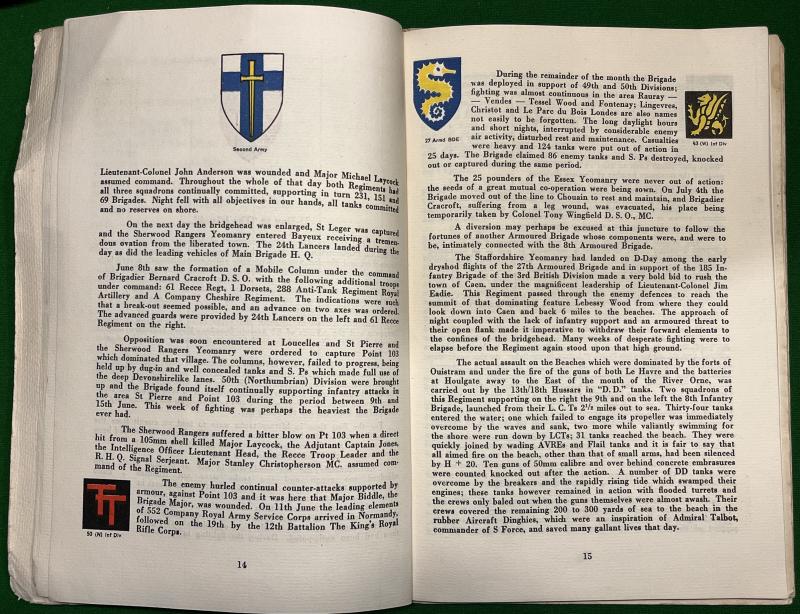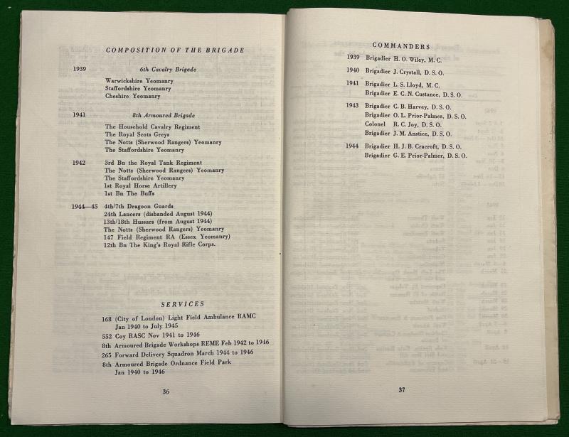 1946 1st Ed. ' The 8th Armoured Brigade 1939 - 1945 ' . Printed in Germany, this card covered history gives an overview of the Brigade and its individual Divisions concentrating on the unit's exploits in Europe. Fold-out colour maps with appendices. Creasing and marking to covers, clean contents.