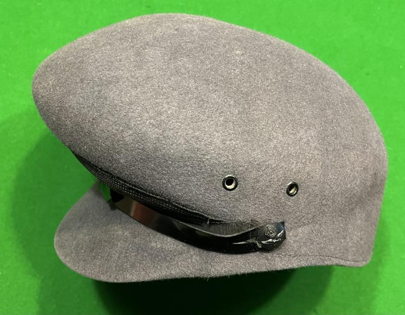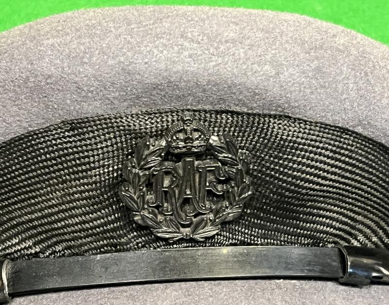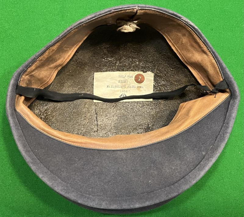 An uncommon, short lived pattern of cap adopted by the WRAF in the early 1950's. Cap is manufactured in felt on a hard shell, with plastic chinstrap secured by black plastic KC RAF buttons. A plastic KC cap badge is mounted on a black half ribbon. Leather headband to interior with original manufacturers label ' 22L/796, Size 7 Failsworth Hats Ltd 1952 ' with broad arrow. This style of cap bridges the gap between the wartime soft WAAF cap and the later WRAF "stewardess" type cap. Good, clean overall condition with some minor moth grazes.