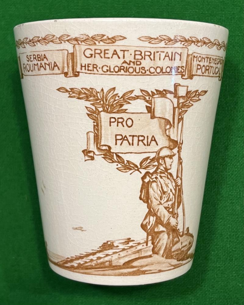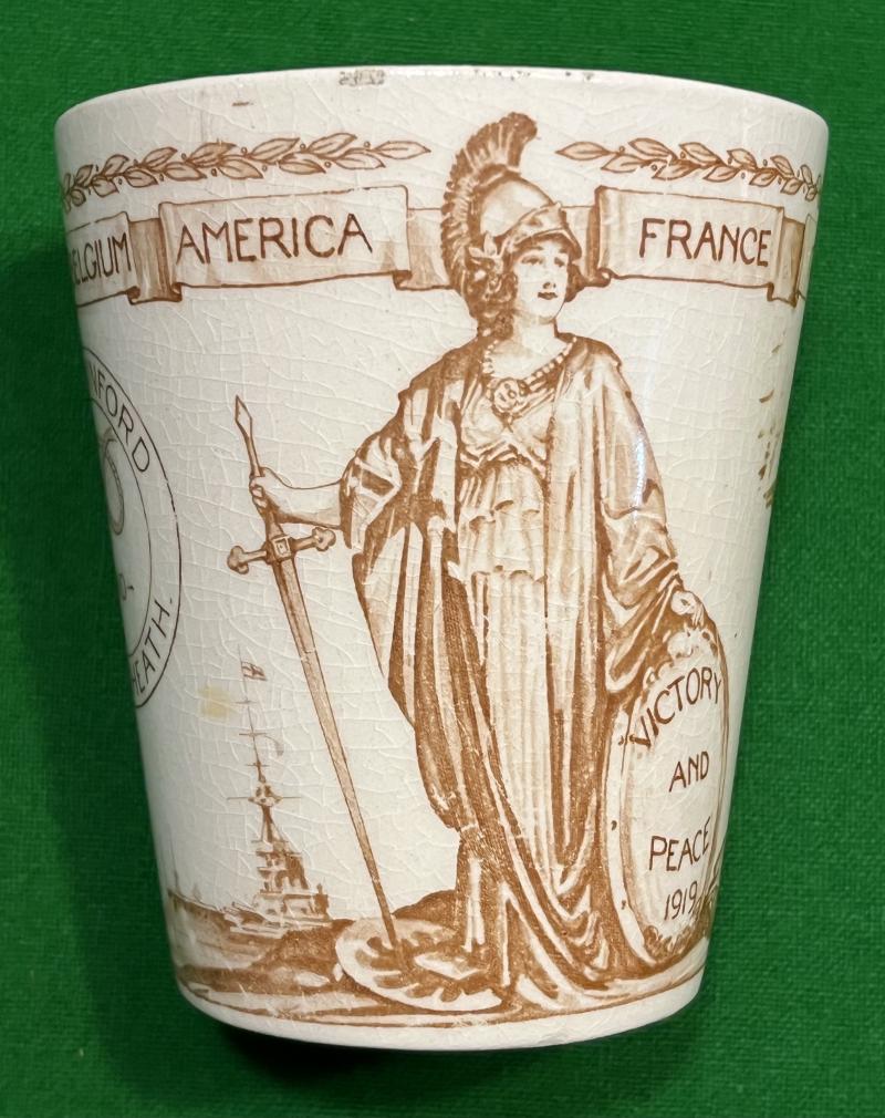 Royal Doulton transfer printed 1919 Victory mug produced for the towns of Kingswinford and Wall Heath in Staffordshire. Featuring a figure of Victory presiding over scenes from the battlefield and a ' Tommy ' with the names of the allied nations around the rim. Good, overall condition with some staining to the interior and minor rubs.