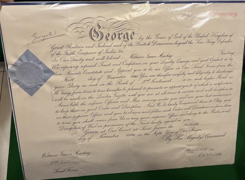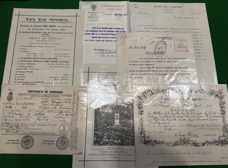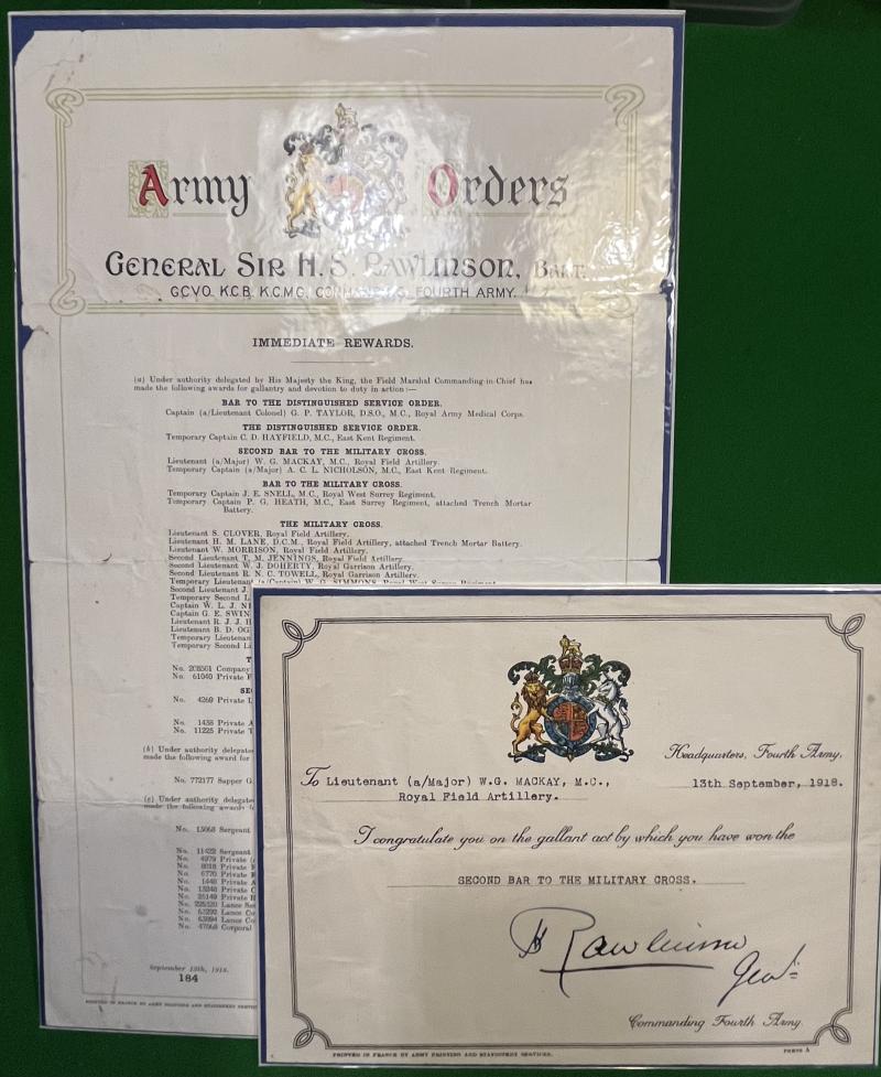 Interesting ephemera grouping to Lt.William Gunn Mackay who joined the RFA having been in the Navy as an engineer. Temporary Commission awarded in 1914 with certificates from Rawlinson listing his MC and second bar accompanied by various letters, marriage certificate and programme and order of service for Wick war memorial. He was awarded his first MC for conspicuous gallantry and his bar awarded for an action where he engaged the enemy over open sights from a range of 300yds whilst under mg fire. His second bar was again awarded for conspicuous gallantry having been gassed. He was also MiD three times and wounded on four occasions going onto be awarded an OBE inter-war and then saw service as a Lt.Col during WW2 where he once again received an MiD. Accompanied by some research but would make a handsome research project of a very gallant officer.