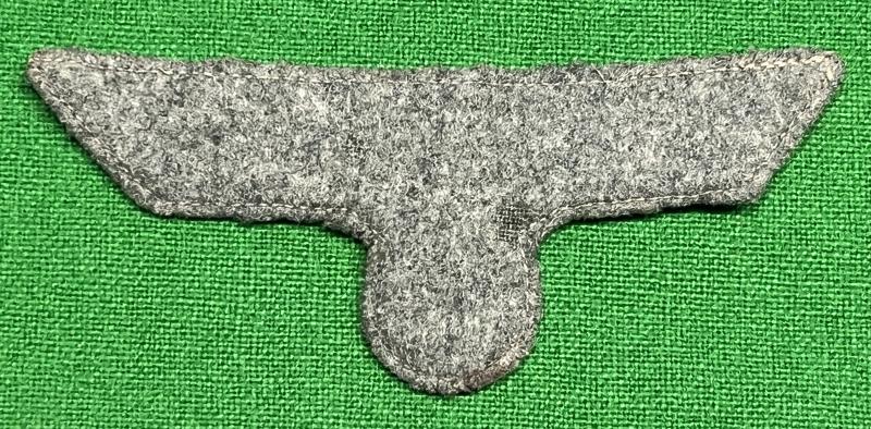 Wehrmacht (Heer) Breast Eagle constructed in a silver flat wire on a light feldgrau background, applied to a darker feldgrau wool reverse. This type of eagle is generally seen on the M35 Dress Tunic, the Waffenrock. Good, used condition, small stain to one edge.