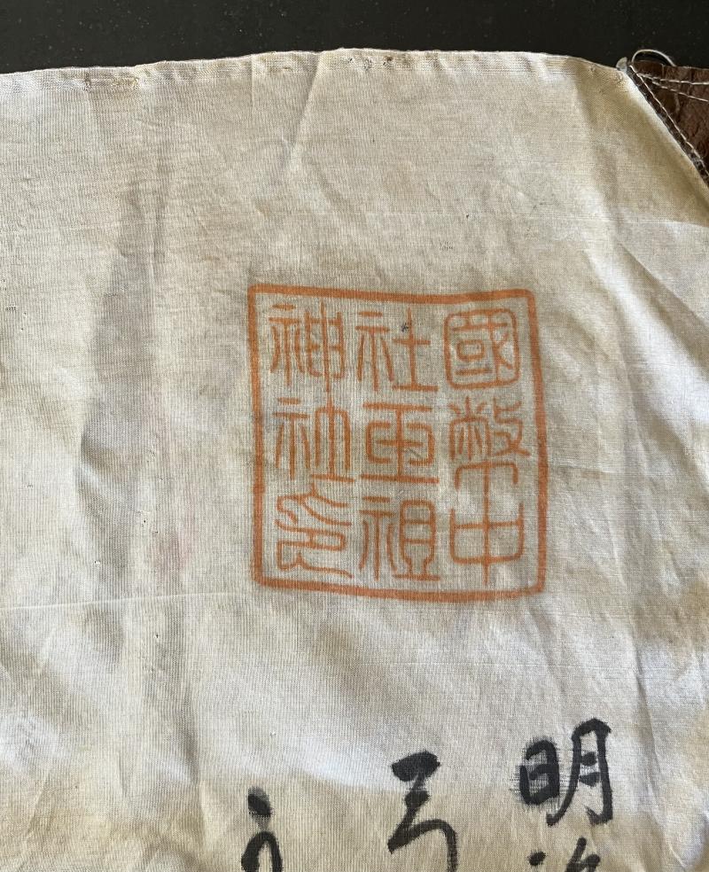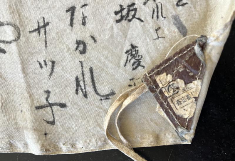 Japanese yosegaki hinomaru or good luck flag. Approx 83 x 68cms printed on silk with two leather reinforced corners and cotton ties. This example is covered in a large number of characters in different hands with prominent larger characters forming the exhortation ' Ki Buun Chokyu ' translating as ' I pray that your military fortunes are long lasting.' Prominent red ' chop ' to one corner. Both leather corner reinforcements and ties are intact with some very minor contemporary staining and fold marks. Good large example.