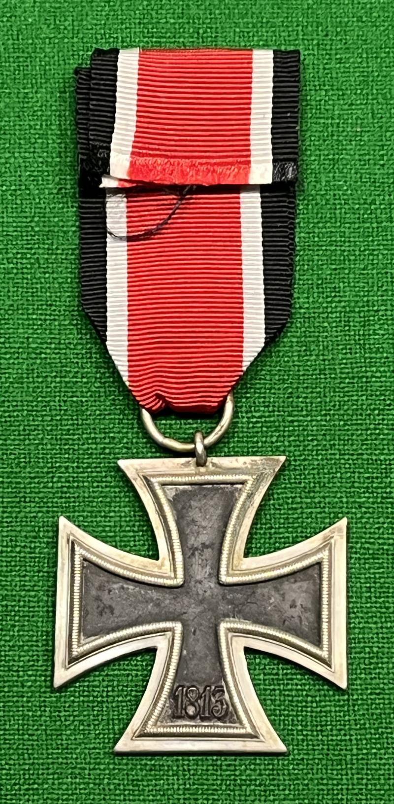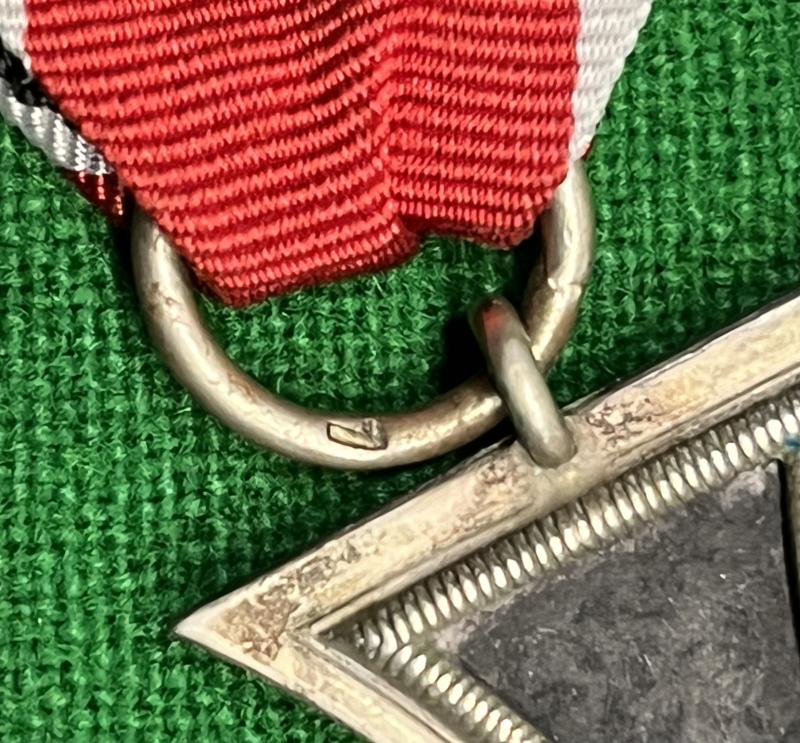Iron Cross Second Class - three piece construction with magnetic iron core ringmarked ' 7 ' indicating manufacture by Paul Meybauer, Berlin. Patinated frame and core. Harder to find ring mark.