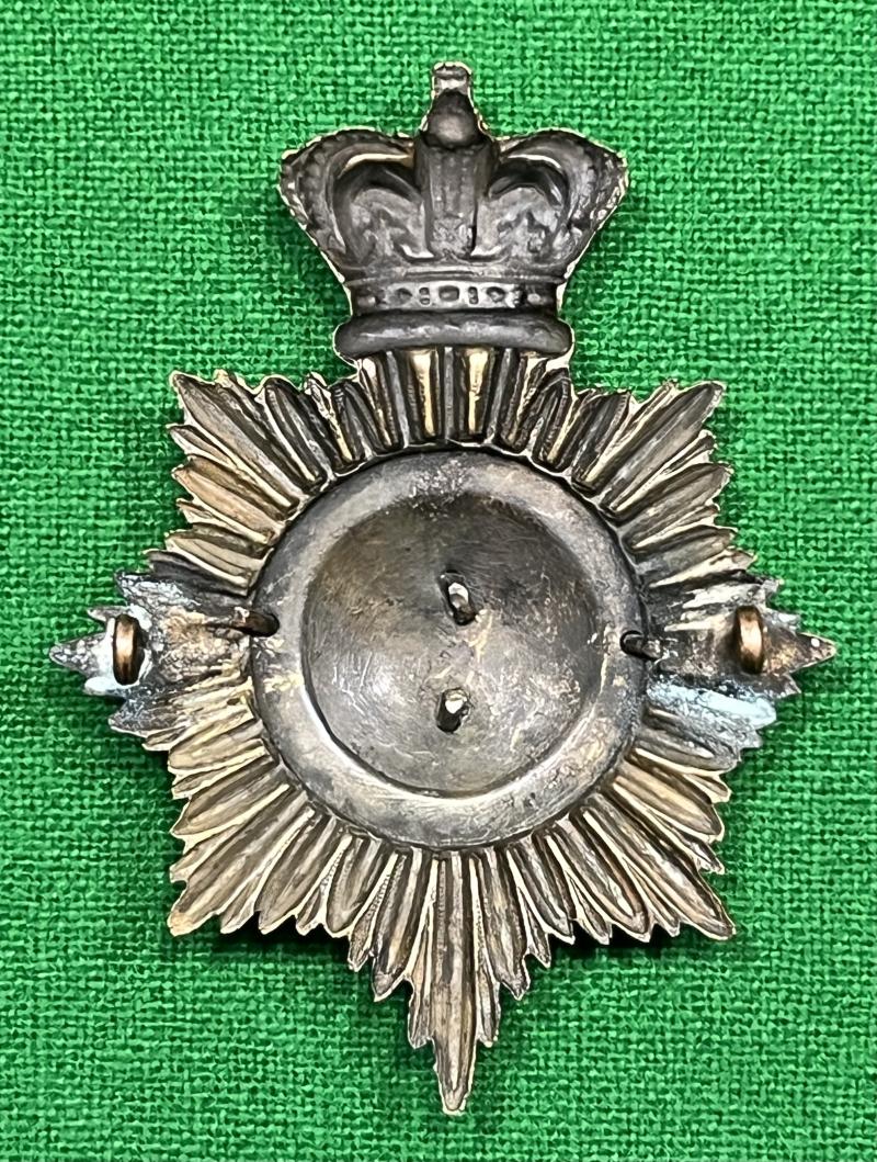 An uncommon, shako plate for an officer/non-commissioned officer of The 2nd South Middlesex Rifle Volunteers. Die-stamped blackened brass crowned star mounted with silvered circlet bearing County Arms to centre. Two lug fastenings to reverse.