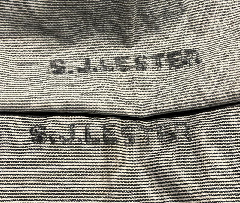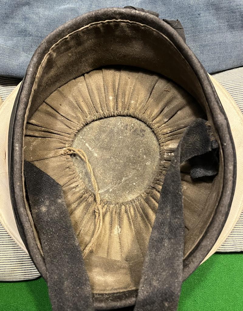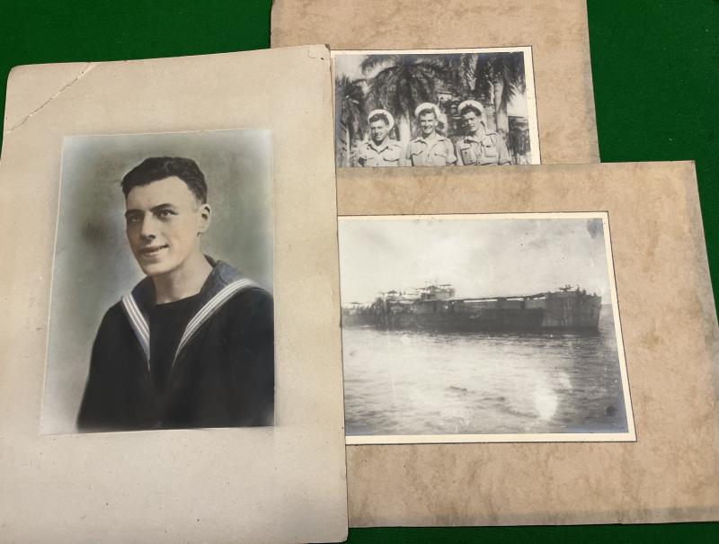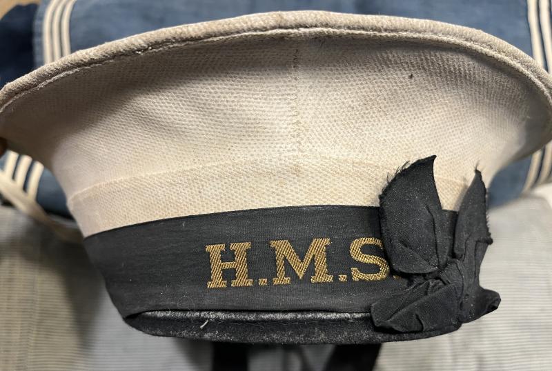 WW2 Royal Navy Signaller's grouping named to Signaller S.J.Lester. Comprising standard Naval o/r's cap bearing the wartime ' HMS ' tally, a pair of red on blue signallers trade badges, two tropical white collars and two standard blue collars. Three photographs mounted on board complete the grouping. All items in good, used condition with the cap showing signs of hair cream.