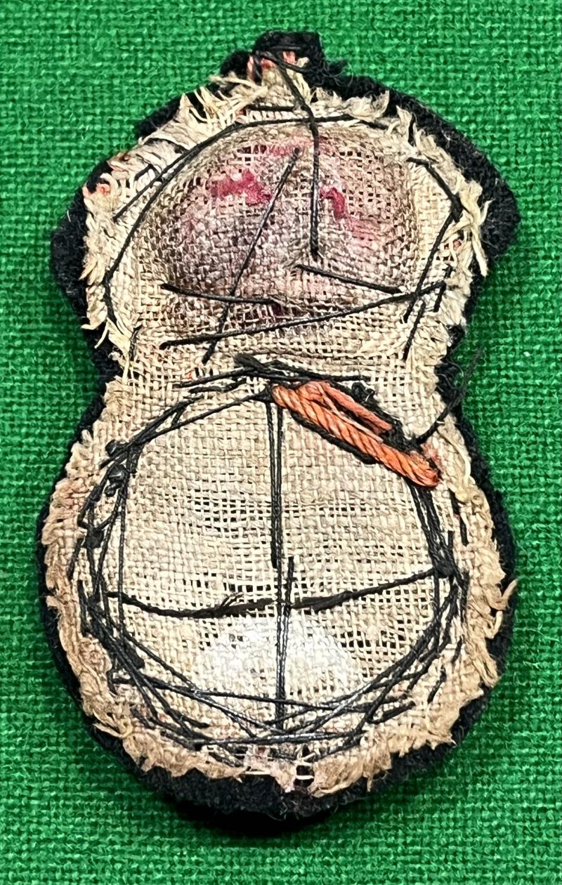 Embroidered cotton on worsted cap badge worn by the enlisted ranks of the RNAS during WW1. Good, used condition with clear evidence of having been removed from a cap.