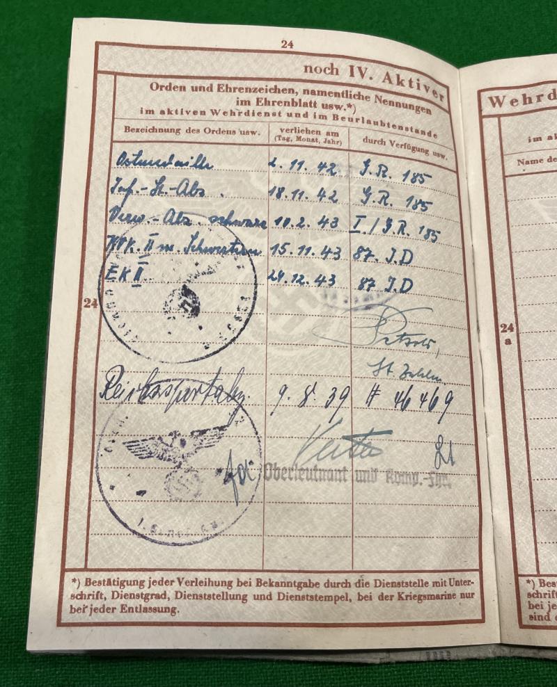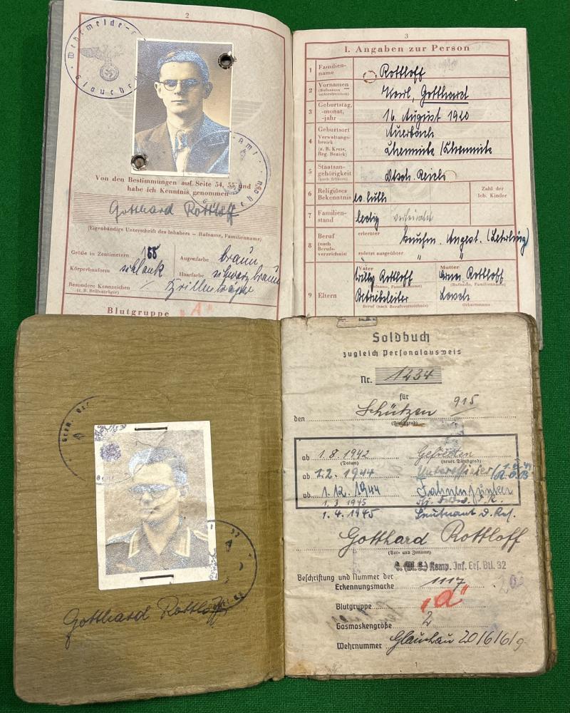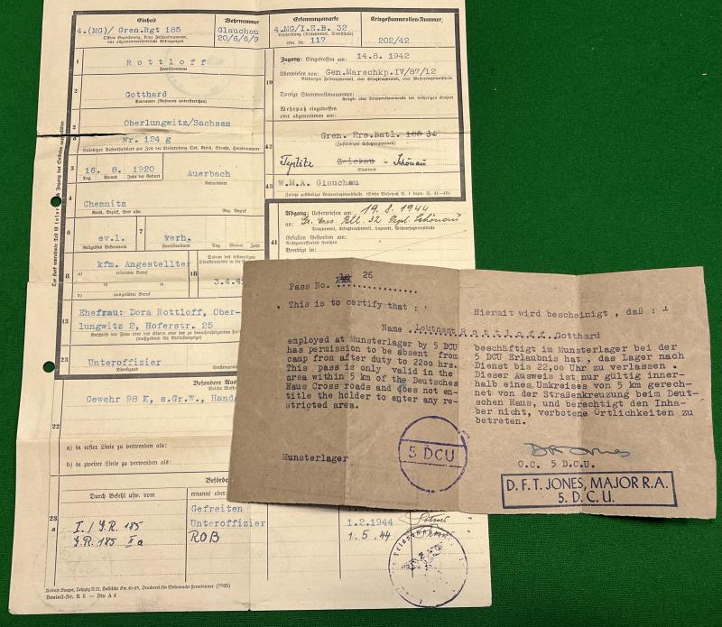 Contained in a special Wehrpass cover this grouping consists of a Soldbuch, Wehrpass, dogtag and paperwork to Uffz.Gotthard Rottloff who initially joined 4.(MG) komp/Inf.Ers.Btl.32 to which his dogtag is made out to. Serving with 4./J.R.185 Rottloff saw service in Russia where he gained the Ostmedaille, Infantry Assault, Black wound badge, KVKII with swords and EKII all gained within a year 1942/43. It would appear that he became an officer cadet before joining what appears to be a Pz.Grenadier Regt. He was subsequently made a POW as evidenced by a pass made out to a now Lt.Rottloff by a camp at Munster. A neat complete grouping to an Infantry veteran who worked his way through the ranks.