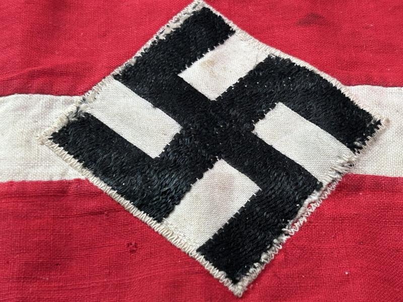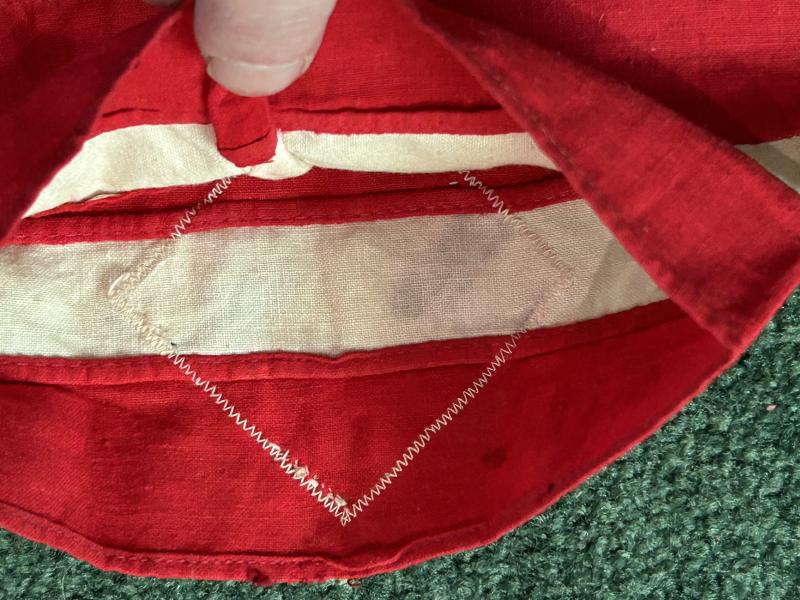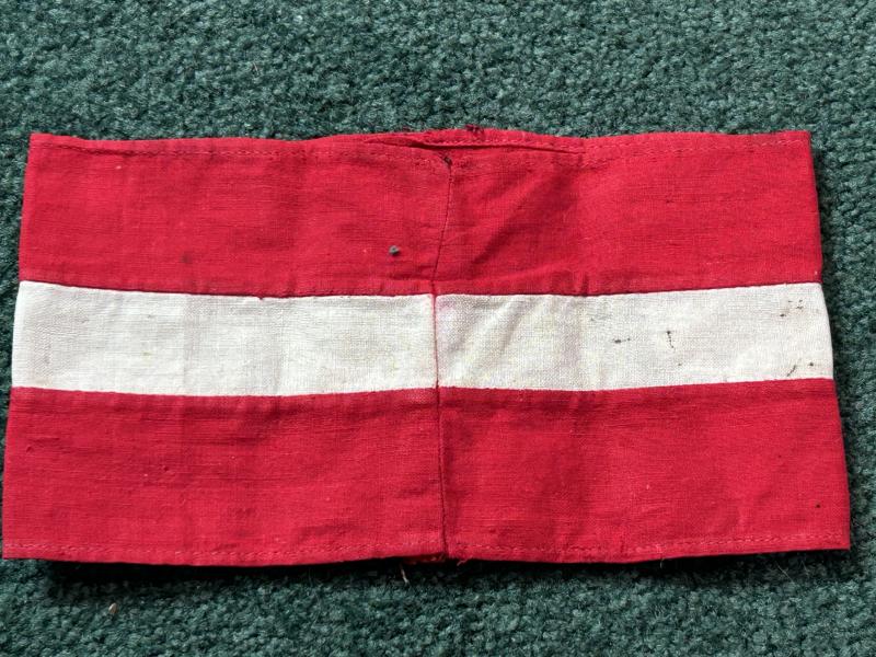 A period HJ armband in cotton. Red and white two piece band with ‘bevo’ swastika separately applied and machine stitched in the centre. Shows signs of use and a little wear. Quite a small size.