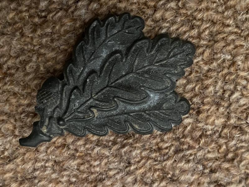 Worn on the left side of the M43 ski cap. In grey metal featuring a sprig of 3 oak leaf branches. One rear fixing pin missing. Slightly grubby/oxidised.