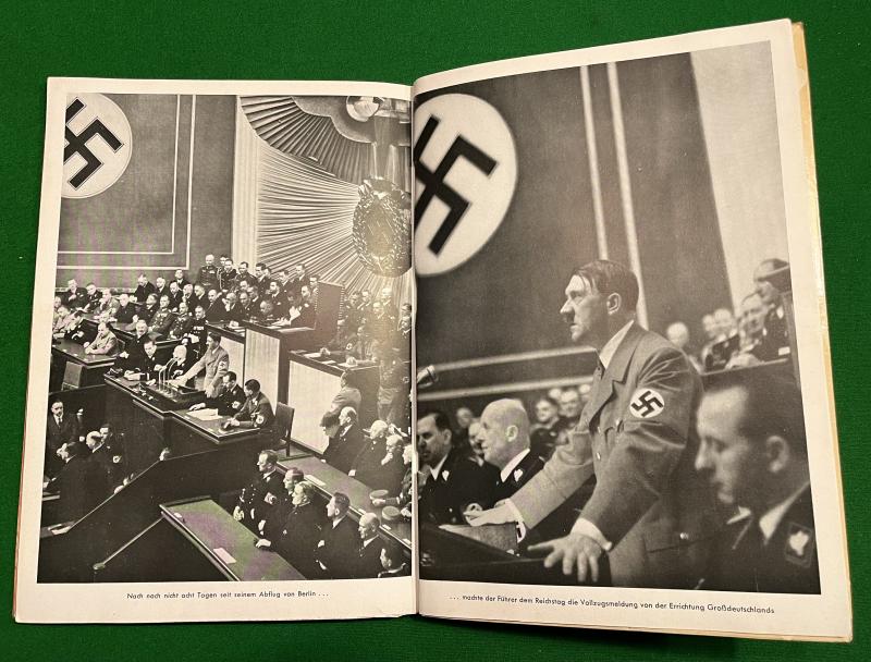 Original 1938 card covered photo study entitled ' Hitler in Seiner Heimat ' essentially Hitler in his homeland. 50+ pages comprising b/w photographs of Hitler greeting crowds in Germany and then in the successful operations surrounding the Anschluss and Sudetenland. Published by the official photographer of the NSDAP Heinrich Hoffman. Good, used condition although the covers have ben covered in a protective film.