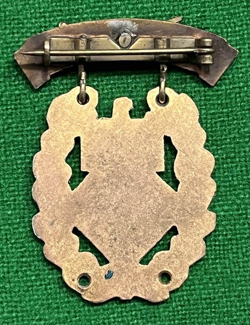 Third Reich Deutscher Schützenverband shooting award in gold with gilt and enamel suspension hangar. The DSV were incorporated into the NSRL-' National Socialist League of Physical Exercise ' the umbrella organisation which covered all sports in the Third Reich. Good, bright condition.