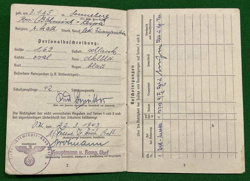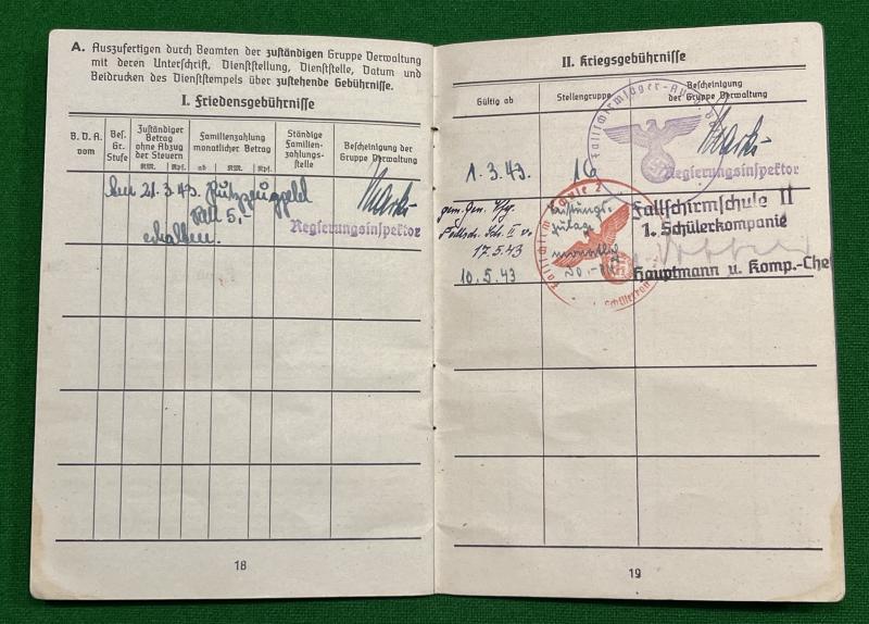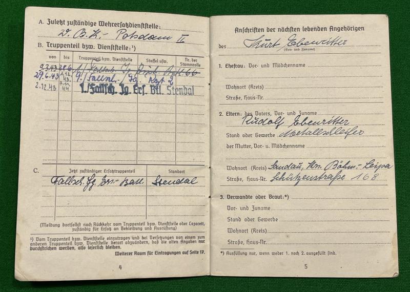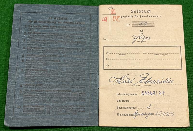 1943 issue Luftwaffe Soldbuch to Jäger Kurt Ebeumitter of 1/Fallschirmjager Ers.Batt. Various entries indicate transfer to 9/Fallschirmjager Rgt.2 before the last entry back with 1/Fallschirmjager Era.Batt at Stendal, the Fallschirmjager school and replacement base. Nothing further known about this individual and worth further research.