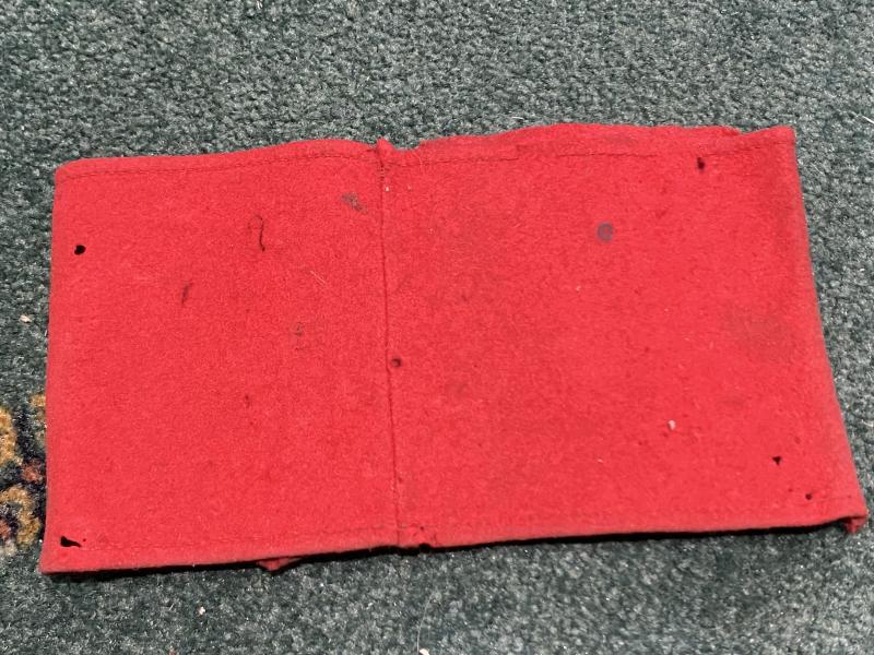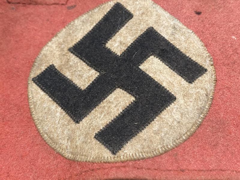 Not sure where this has been stored. From the look of it, face upwards in a loft or attic. The obverse side is quite grubby and faded. It is of 3 piece construction with red wool main part, central round white circle and a separate black swastika sewn on top. The reverse wool is much brighter. Has been sewn to a tunic or shirt. Some minor moths nips but otherwise fine.