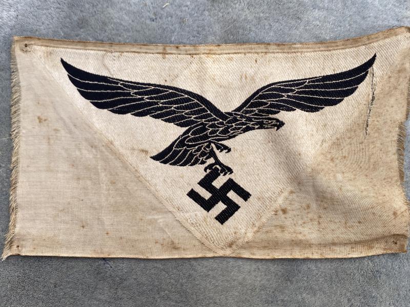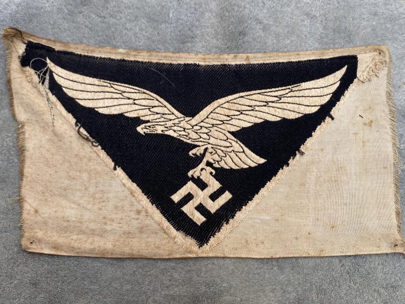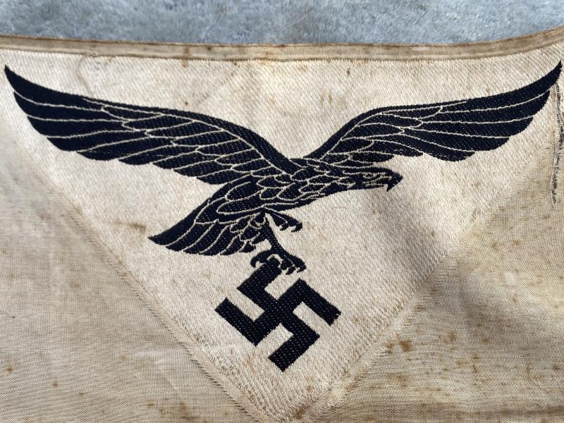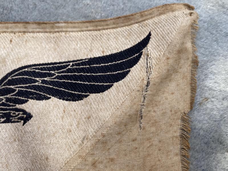 Always a good display item behind a Luftwaffe collection or with daggers etc. This is an unused and uncut ‘bevo’ Luftwaffe sports vest eagle. Sewn to the sleeveless vest often seen in photographs of war time physical activity. Cream cotton background with black Luftwaffe eagle. One very small tear to the cloth beside eagle left wing. Otherwise, just a bit grubby!
