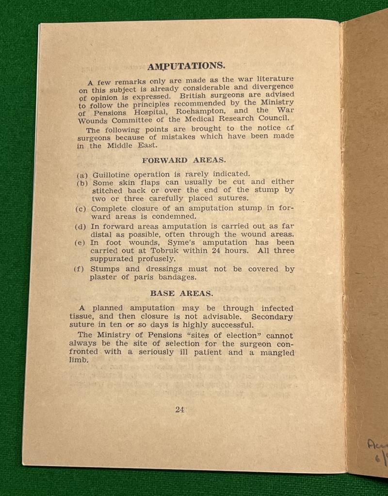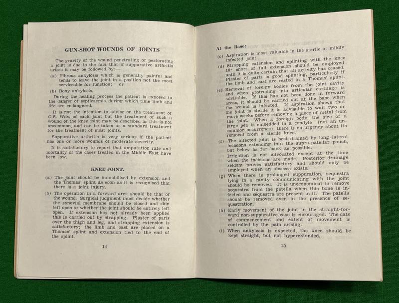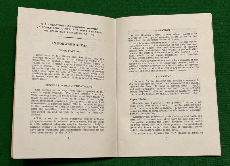 1942 manual produced by GHQ Middle East Forces entitled ' The treatment of gunshot wounds of bones and joints, and some remarks on splinting and amputations '. 24pg essentially an aide memoire based on knowledge gained during the fighting in the desert. Clipped cover but otherwise clean condition.